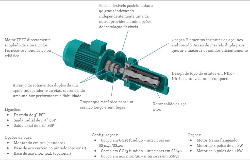 Bomba de cavidade progressiva autoferrante com capacidade de aspiração significativa que reduz os sólidos a pequenas partículas, mantendo o fluxo mesmo em tubos de menos diâmetro. Permite caudais até 3,5 m3/h e pressões até 6 bar.